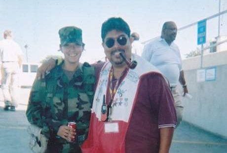Though here is a different photo op, of the author during down time at Southern University in Baton Rouge, site of the Red Cross Minidome Shelter. The red “geek” vest was official Red Cross attire. The pictured galpal, a Louisiana National Guard member who had also served in the Russian Army, jazzed it up for me. Don’t ask.