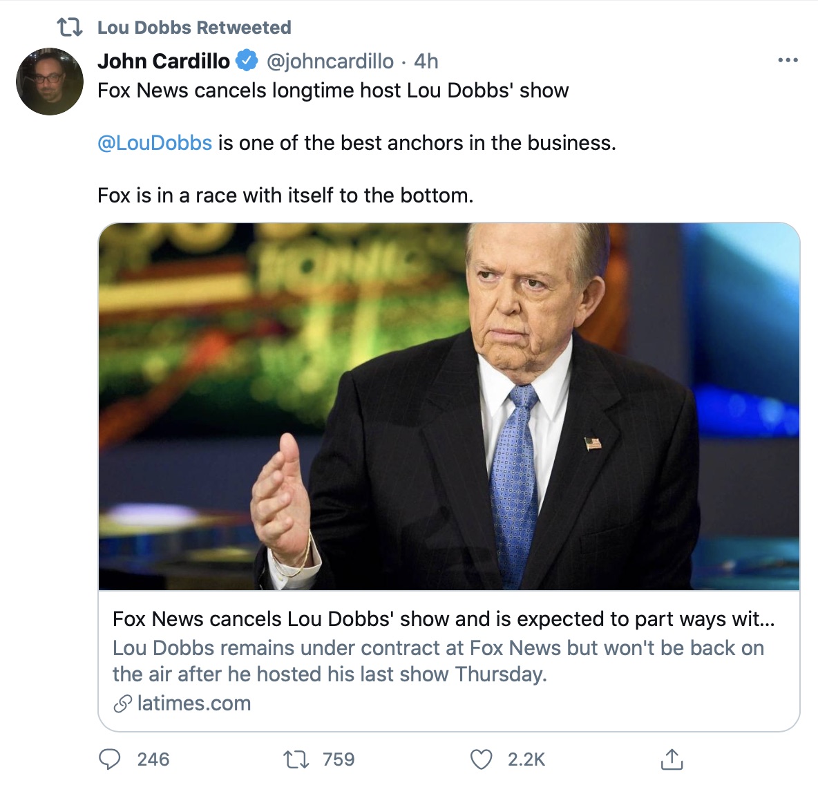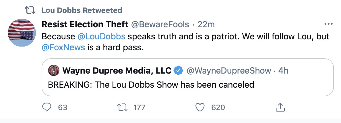 Hours after Fox News announced it was cancelling Lou Dobbs’ hit show on Fox Business, Dobbs went on Twitter to hit back at the network by retweeting people taking shots at Fox.
